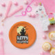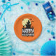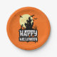 Feliz ilustracion de diseño de texto de Halloween con decoración de casa embrujada, cementerio y murciélagos en luna llena sobre fondo naranja de grano