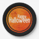¡Este diseño espeluznante y sencillo hará que los huéspedes se sientan como en Halloween! El diseño presenta una linterna y un murciélago sobre un círculo de mármol naranja y fondo negro, con las palabras "Feliz Halloween".
