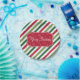 Feliz ilustracion navideño con texto y diseño de copos de nieve sobre fondo rayado rojo, blanco y verde