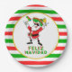 Este divertido plato de papel de vacaciones incluye el personalizado Santa Claus con un sombrero mexicano festivo y una imagen de texto "Feliz Navidad" en rojo, verde y amarillo con fondo rojo, blanco y rayas verdes. Perfecto para sus celebraciones.