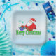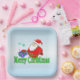 Feliz Navidad Papá Noel con Navidades personalizados de regalo Papel Las placas presentan arte original incluyendo Santa moldeando un regalo envuelto de colores con una cinta roja, copos de nieve azules y blancos contra el cielo azul claro, y Feliz Navidad escrito en una fuente dimensional verde que coincide con la cinta del regalo. Estos platos de bonito le dan un toque festivo a su fiesta de vacaciones. Personalízalos añadiendo tus propias imágenes, texto o fondo.