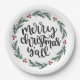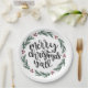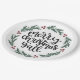 Añade algo de espíritu Navidad a tu cena o fiesta con este lindo plato de papel de "Feliz Navidad y todos" con letra de escritura negra, enmarcado en un círculo de huecos.