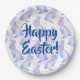 Felices placas de papel de Pascua y servilletas de papel a juego con conejillos azules y morados.