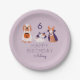 Platos de papel para fiestas temáticas de Halloween para niños con ilustraciones de perros y gatos disfrazados (murciélago, fantasma y vampiros). Personalizar este producto añadiendo la edad y el nombre del niño.