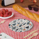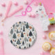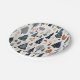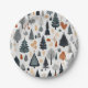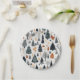 Feliz patrón de árbol de Navidad planchas de fiesta. Estos platos, con una mezcla festiva de tonos grises, naranjas y negros, le dan un toque de elegancia moderna a su fiesta.