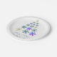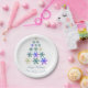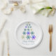 Placas festivas de papel navideño de la familia de los copos de nieve. Elegantes y festivos platos fiestas de Navidades con el deseo de Felices Fiestas y su nota personal. Hermosos árboles de Navidad hechos de copos de nieve grandes y pequeños. Personalice las placas con su nombre y nota. El texto está en un guión de moda.