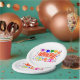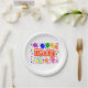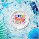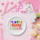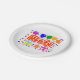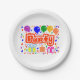 Platos redondos de papel de 7 pulgadas opcionales, con un dibujo/diseño de la palabra = Fiesta, en color rojo y blanco, con algunos globos de colores, confeti y paquetes de regalos, = (Dibujo/diseño de P. J.M.) = en él.