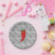 Un personaje de dibujos animados de pimiento rojo y picante. Diseño original con patrón de encaje negro y blanco en el fondo.