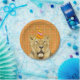 Características del diseño divertidas de la fiesta de cumpleaños del juerguista una foto de un león femenino que coloca. La leona tiene un gorra del fiesta en su cabeza con las rayas marrones, azules y amarillas. El león del juerguista está en un fondo de la tela escocesa a cuadros del naranja, amarilla y verde. ¡Este león de la diversión con un diseño del gorra de la fiesta de cumpleaños hace juego a nuestro fiesta como un león animal con las invitaciones, el franqueo y las servilletas del cumpleaños del gorra!