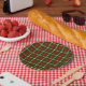 Diseño para una fiesta de cumpleaños con tema escocés, boda o evento especial en patrón de cuadros tradicional escocés rojo, verde y amarillo.