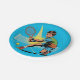 Un vibrante ilustracion de arte pop que representa a un joven tenista a mitad de acción. El atleta es capturado en una posición dinámica y agobiante, atrapando poderosamente una raqueta de tenis y una bola, representada en una sorprendente paleta de azul eléctrico, naranja brillante, verde vibrante y tonos amarillos soleados. Se encuentra un poco alejado del centro, con un fondo azul eléctrico adornado con puntos de tono medio y patrones clásicos de Ben-Day, mientras que una red de tenis estilizada y bien montada añade una capa de profundidad. Un solo foco de atención destaca al muchacho y su raqueta, proyectando sombras angulosas y agudas y creando una sensación de energía cinética dentro de la escena.