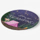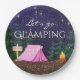Platos de papel para fiesta de cumpleaños de chicas con glamour al aire libre con una linda tienda rosa y hoguera en un fondo de bosque estrellado por la noche. Estos platos de papel para fiesta de cumpleaños de chicas acampando son fácilmente personalizables para su evento simplemente agregando su texto.