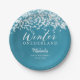 Plato de papel para la fiesta de cumpleaños de un niño con tema de copos de nieve en invierno que incluye texto de tipografía que dice "Winter ONEDERLAND" con brillantes copos de nieve por ahí. El fondo es azul. Genial para el fiesta de un niño durante la época de los Navidades.