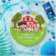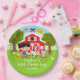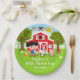 Esta placa linda y divertida presenta a una niña de pelo negro con piel clara junto a un granero rojo con una veleta de gallo. Hay adorables animales de granja como una vaca, un cerdo y una gallina. Al fondo hay un cielo azul brillante, manzanos, sol, mariposas y margaritas. El texto combina fuentes en negrita y sans serif para un look elegante y moderno. Esto es perfecto para una fiesta de cumpleaños con tema de granja.