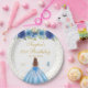 Este elegante y glamuroso plato de fiesta de cumpleaños incluye una hermosa princesa con el pelo rojo marrón y piel clara en un vestido de bolas azul. El texto combina el guión manuscrito y las fuentes sans serif modernas para un aspecto elegante y sofisticado. Los arreglos florales, las mariposas y los confeti dorados crean una perfecta mezcla de rústico y moda. Gráficos de www.etsy.com/uk/shop/SunflowerDayLove