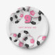Estas placas de papel de fiesta de cumpleaños con temática de fútbol son totalmente de personalizable y cuentan con grupos de bolas de fútbol rosadas, negras y blancas en los bordes superior e inferior - personalizan con su texto personalizado - por katz_d_zynes