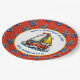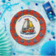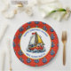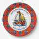 Platos de papel para fiesta de cumpleaños de niño con tema náutico o marítimo. Anclas y un barco de vela rojo, amarillo y azul. Agregue el nombre del niño en el área de personalización.