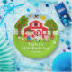 Esta placa linda y divertida presenta a un niño de cabello marrón con piel clara junto a un granero rojo con una veleta de gallo. Hay adorables animales de granja como una vaca, un cerdo y una gallina. Al fondo hay un cielo azul brillante, manzanos, sol, mariposas y margaritas. El texto combina fuentes en negrita y sans serif para un look elegante y moderno. Esto es perfecto para una fiesta de cumpleaños con tema de granja.