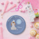 Celebra el cumpleaños de tu hijo con este lindo ilustracion de cachorro con un gorra fiesta y un globo. Personaliza este divertido plato de papel de cumpleaños agregando el nombre y la edad de tu hijo. El gorra fiesta y el globo son de color azul.