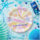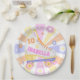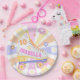 Un divertido diseño pastel con patinaje de rodillos blancos con espacio para añadir un nombre y una edad, al fondo se ve una ráfaga de arcoiris con margaritas. Este diseño está decorado con una paleta de colores rosa, naranja, amarillo y violeta. Vea toda la colección de fiestas coincidentes.
