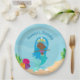 Cute personalizado de los platos de la fiesta de cumpleaños de sirena que incluyen una hermosa niña afroamericana a la que le encanta nadar en el verano con sirenas. Cuenta con una sirena negra de pelo azul bonito nadando alrededor del hermoso coral del océano. Bonita decoración fiesta infantil con un texto personalizado.