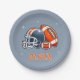 Placas de papel de la fiesta de cumpleaños del Personalizado del casco de la pelota de fútbol. Platos modernos y divertidos de fútbol para cumpleaños con un nombre personalizado. Con un atrevido ilustracion personalizado de un futbol y casco en naranja y gris. Añade tu nombre.