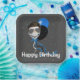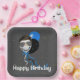 La cara sonriente del hombre con el pelo y gafas de sol aviador en globos fiestas y confeti para una fiesta de cumpleaños. Se puede cambiar el color de fondo gris. El texto es editable.
