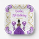 La invitación a este plato de cumpleaños incluye un marco dorado elegante, una bella princesa con piel oscura y un vestido morado, flores y un globo. Esto es perfecto para una fiesta de cumpleaños.