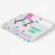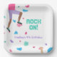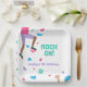 Rock! La pared de escalada con agujeros coloridos está en una textura acuática divertida. El texto dice "Rock On" con espacio para el chica de cumpleaños o el mensaje del niño debajo. Platos perfectos para una fiesta de cumpleaños con temática de escalada en roca/