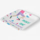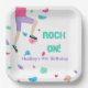 Rock! La pared de escalada con agujeros coloridos está en una textura acuática divertida. El texto dice "Rock On" con espacio para el chica de cumpleaños o el mensaje del niño debajo. Platos perfectos para una fiesta de cumpleaños con temática de escalada en roca/