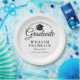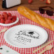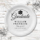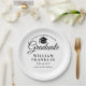 Un plato de papel elegante para fiesta de graduación en blanco y negro que presenta un adorno de gorra negro con los detalles de tu graduado en tipografía moderna. Diseñado por Thisisnotme©