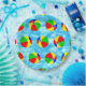 Platos de fiesta de verano con bola de playa en una piscina fresca. Añadir texto a personalizar.
