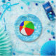Diseño fiesta de verano con bola de playa en una piscina fresca. Añadir texto a personalizar.