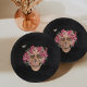 Un espeluznante diseño de fiesta de moda de Halloween con un ilustracion floral de cráneo coronado con flores de color orquídea rosa en un fondo negro humeante.
