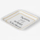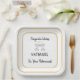 Añade algo de moda personalizado adicional a las mesas de su fiesta de jubilación con estas placas cuadradas de papel. Las placas muestran el mensaje "Felicitaciones por tu jubilación" en la tipografía de guiones, y se pueden personalizar con un nombre. Se retratan dos elegantes vasos de champán espumoso para dar un toque de celebración. El diseño es en su mayoría blanco, con texto negro y un doble borde dorado falso alrededor del borde.