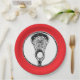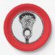 Fiesta de Lacrosse o platos de eventos de equipo con arte de palos laxos sobre fondo rojo.