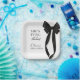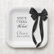 Platos de papel para fiestas diseñados con un clásico motivo de lazo negro y la frase está atando el nudo. Creado para un ambiente de mesa limpio y elegante que combina bien con la decoración de boda en blanco y negro. Adecuado para duchas de novia, fiestas de compromiso, reuniones de despedida de soltera y celebraciones de boda. Texto totalmente personalizable con un diseño listo para imprimir para la vajilla de la fiesta.