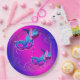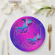Platos de papel para fiesta de máscaras rosados y púrpura con hermosas máscaras de plumas azules turquesa y púrpura sobre un hermoso fondo púrpura y rosa. Puedes agregar texto para personalizar estos hermosos platos de papel para fiesta de máscaras púrpura y azul turquesa.