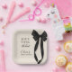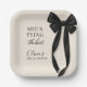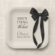 Platos de papel de fiesta diseñados con un motivo clásico de corbata negra y la frase ella está atando el nudo. Creado para un ambiente de mesa limpio y elegante que combina bien con la decoración de boda en negro y blanco. Adecuado para fiestas de despedida de soltera, fiestas de compromiso, reuniones de chicas y celebraciones de boda. Texto totalmente personalizable con un diseño listo para imprimir para artículos de mesa de fiesta.