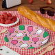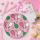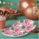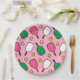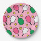 Platos creativos para fiestas o eventos de pickleball con paletas de color rosa intenso y verde fresco, y patrón de pelotas amarillas sobre fondo rosa para tus jugadores de pickleball favoritos.