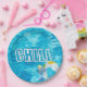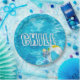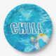 texto "chill" en ondulante efecto de tipo de letra para el fiesta de la piscina con cóctel y bola de playa salpicada en agua turquesa de la piscina.