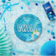 texto "escalofriante" con efecto ondulante para el fiesta de la piscina con bola de playa salpicada en agua turquesa de la piscina.