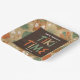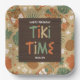 Las placas de papel cuadrado temático de los fiestas tikis presentan en el centro un cartel rústico de madera con tipografía "Tiki Time" y "Happy Birthday" con un nombre personalizado rodeado de máscaras tiki, piñas, flores de hibisco, palmeras y hojas de monastera. Perfecto para fiestas de cumpleaños tropicales, de luau y de playa.