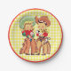Platos de fiesta de temática occidental con una vaquera y un vaquero. El fondo es el cheque amarillo con un borde rojo. Vea este y otros diseños similares en otros suministros de fiesta en el Rodeo Days Store.