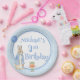 Conejo Cute Blue fiesta de cumpleaños plato de papel personalizado con pasteles de zanahoria y globos. Marco de manteca azul y blanca con pastel de zanahoria y gráfico de Peter Rabbit. Personaliza con tu elección de nombre. Perfecto para la fiesta de cumpleaños del conejo más dulce.