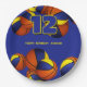 Estas placas de papel de fiesta con temática de baloncesto son totalmente de personalizable y cuentan con grupos de baloncesto en los bordes superior e inferior - cada una de las bolas de básquet tiene dos paneles de color, uno azul y otro dorado - personalizan con su texto personalizado - por katz_d_zynes