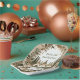 Diseñados con encantadores tonos rústicos y con un fondo forestal, estos platos combinan tonos tierra con un toque de brillo. Las estrellas brillan por encima, mientras que la elegante flora realza el encanto. Ideal para una noche de aventura, estos platos servirán como recordatorio de historias inolvidables compartidas bajo el lienzo.