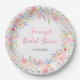 Este plato para fiesta de novia con ilustraciones de acuarela lindas y caprichosas presenta flores silvestres coloridas en rosa, morado, naranja y amarillo con follaje verde. El texto combina fuentes manuscritas y sans serif para un estilo moderno y elegante. Esto es perfecto para una fiesta de novia en primavera o verano.