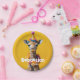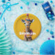 Una encantadora jirafa de bebé se vistió para una celebración, usando un gorra festivo de fiesta con patrones coloridos y decoración esponjosa. La jirafa tiene una boa de plumas mullida y multicolor y se alza sobre un fondo amarillo brillante, creando una escena alegre y caprichosa.