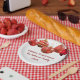 Placas de papel para fiestas navideñas de Navidades de ornamentos rojos y dorados para un Fiesta de Navidades familiares o corporativos.